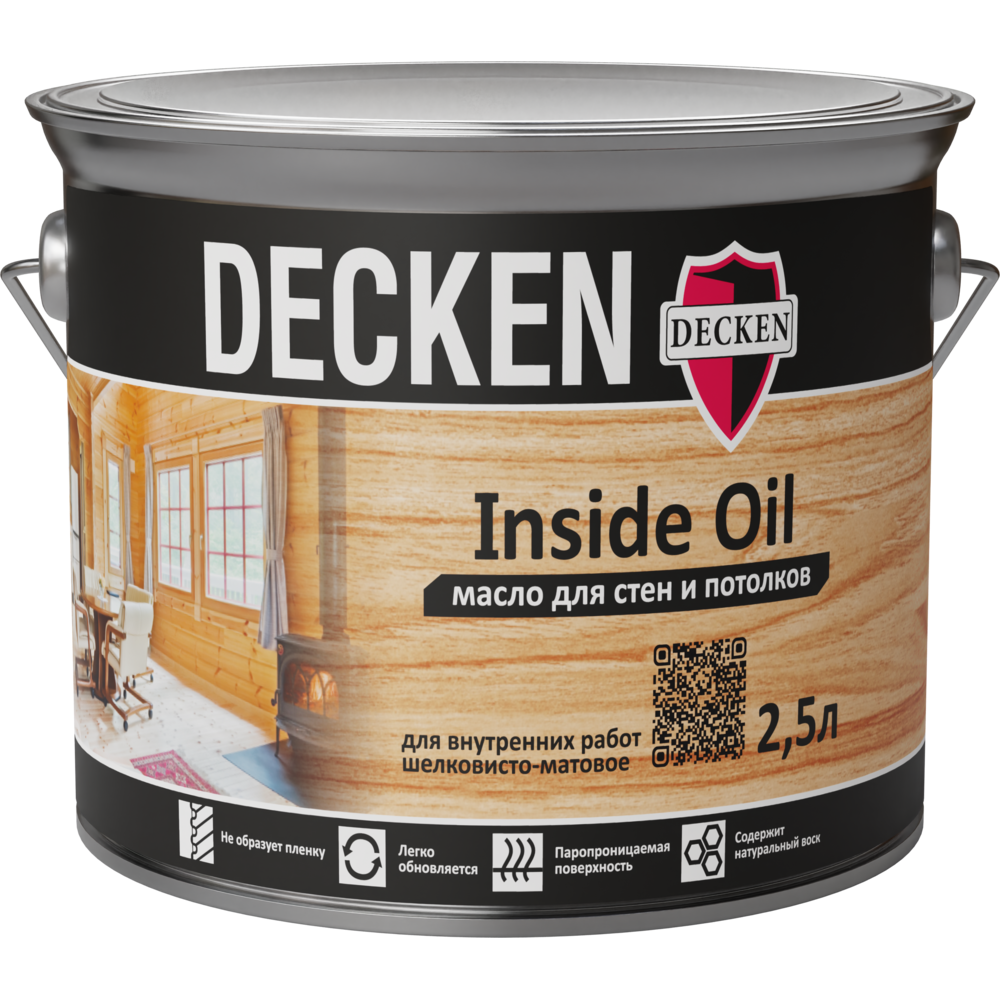 Масло для стен и потолков DECKEN Insidе Oil – цветное прозрачное шелковисто-матовое покрытие для внутренних работ на основе натуральных масел и восков. Предназначено для обработки стен и потолков, дверей, плинтусов, декоративных балок, а также изделий из клееной древесины, ДСП и пробки. Рекомендовано для окрашивания мебели. Придает поверхности водо- и грязеотталкивающие свойства.
