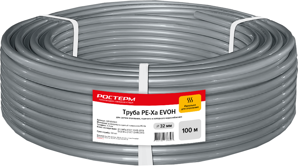 Труба PЕ-Хa диаметром 32 мм изготовлена из материала высокой прочности - сшитого полиэтилена толщиной стенки 4.4 мм с кислородозащитным слоем EVOH. Трубы РОСТерм PЕ-Ха EVOH - это универсальные трехслойные трубы, которые используются как в радиаторном отоплении, так и в системах горячего и холодного водоснабжения. Температура эксплуатации труб PE-Xa составляет от +5 до    + 95 °C (при транспортируемой жидкости - воде).