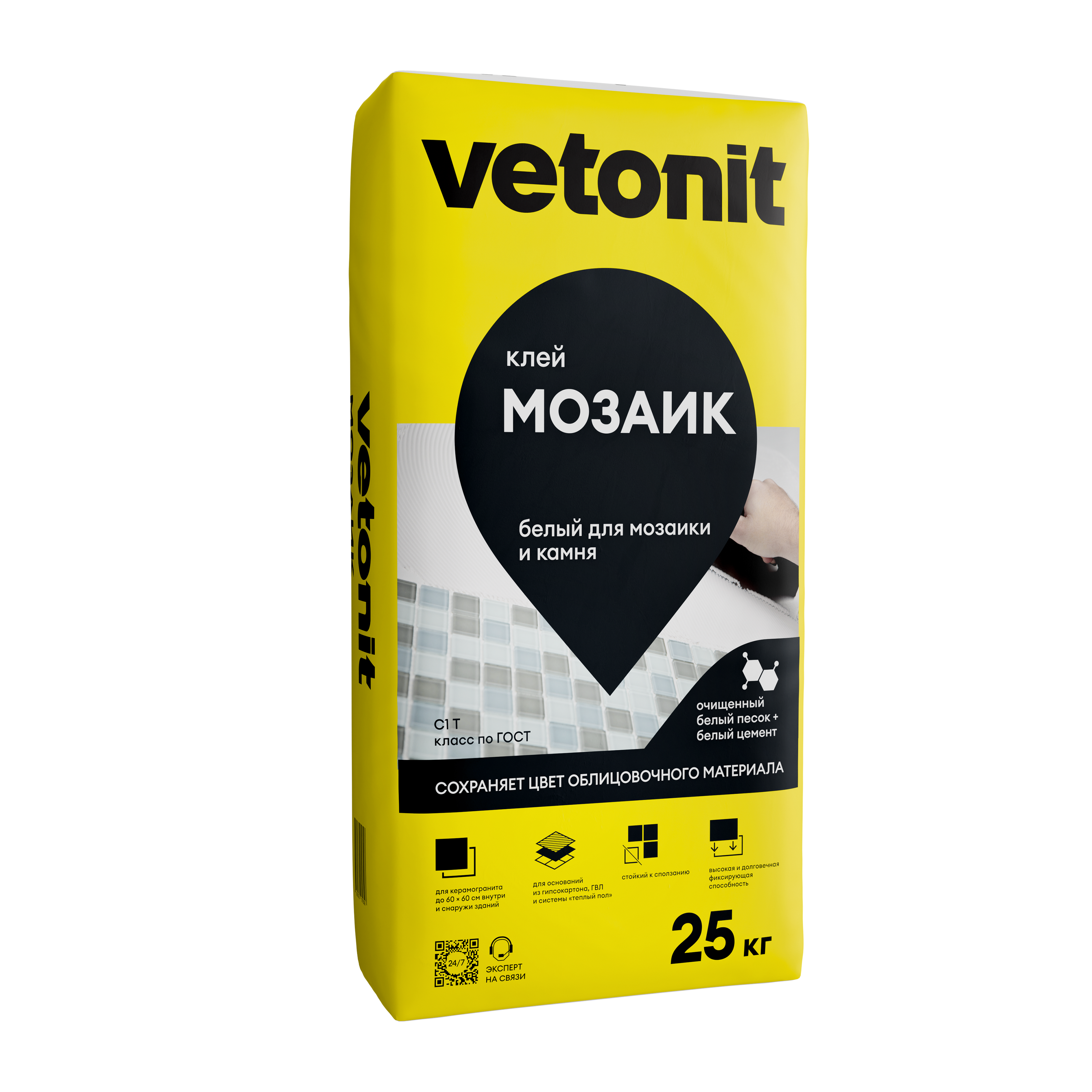 Vetonit® Мозаик - белый клей класса С1 Т. Подходит для прозрачной стеклянной мозаики и натурального камня светлых оттенков - не меняет цвет облицовочного материала, сохраняет эстетику на долгий период эксплуатации. Класс клея позволяет укладывать крупный керамогранит на стены (до 45х45 см) и пол (до 60х60 см). Совместим с системой «Теплый пол». Обеспечивает прочное клеевое соединение в условиях влажности: ванная комната, хамам, наружные работы. Устойчив к плесени и грибкам. Морозостойкий. Может также быть применён как белая затирка.