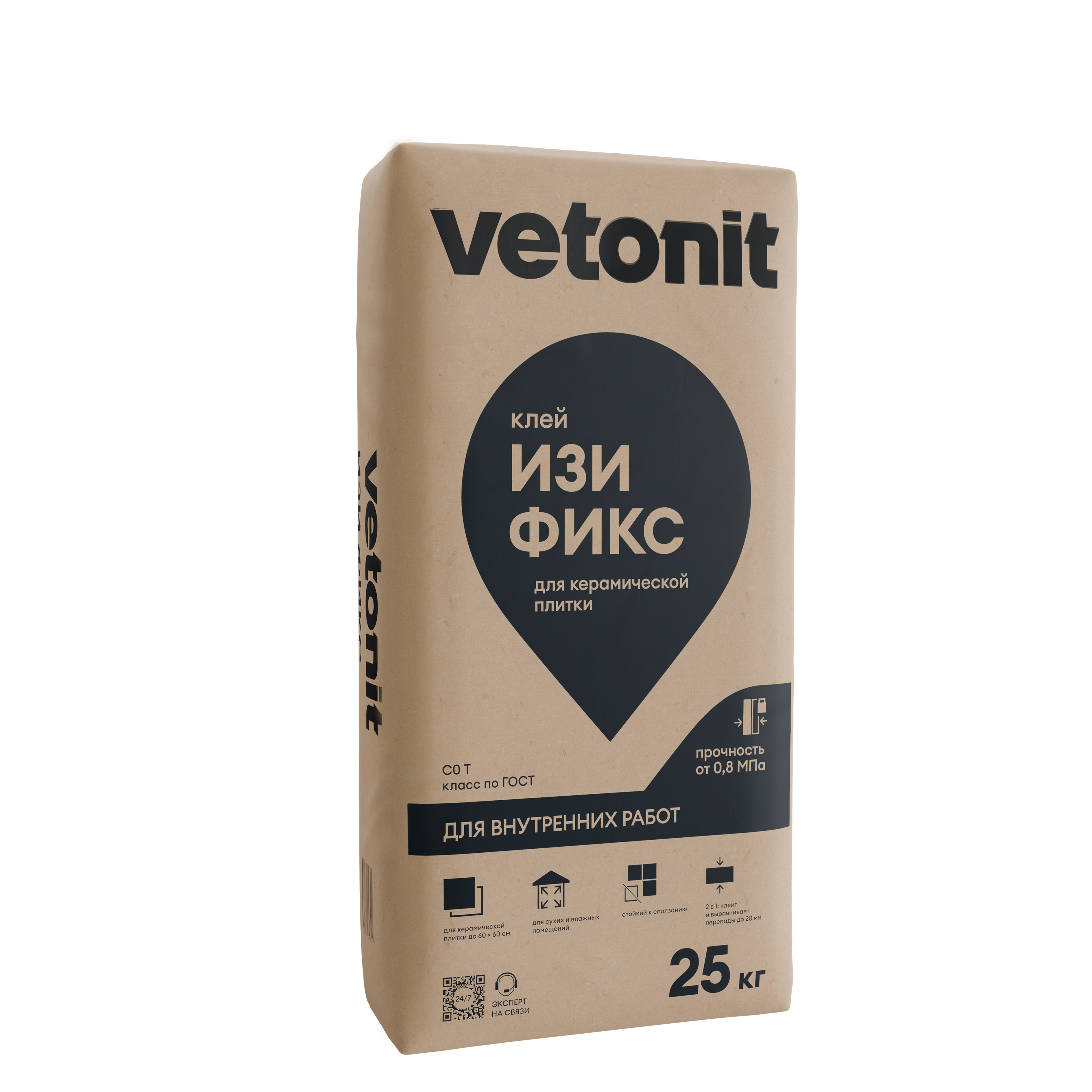 Vetonit Изи фикс - пожаробезопасный, влагостойкий устойчивый к плесени, грибкам и бактериям. Пластичность удобство в работе отсутствие сползания плитки, надёжная фиксация и легкое замешивание, - вот всё то, за что этот клей так любят мастера!