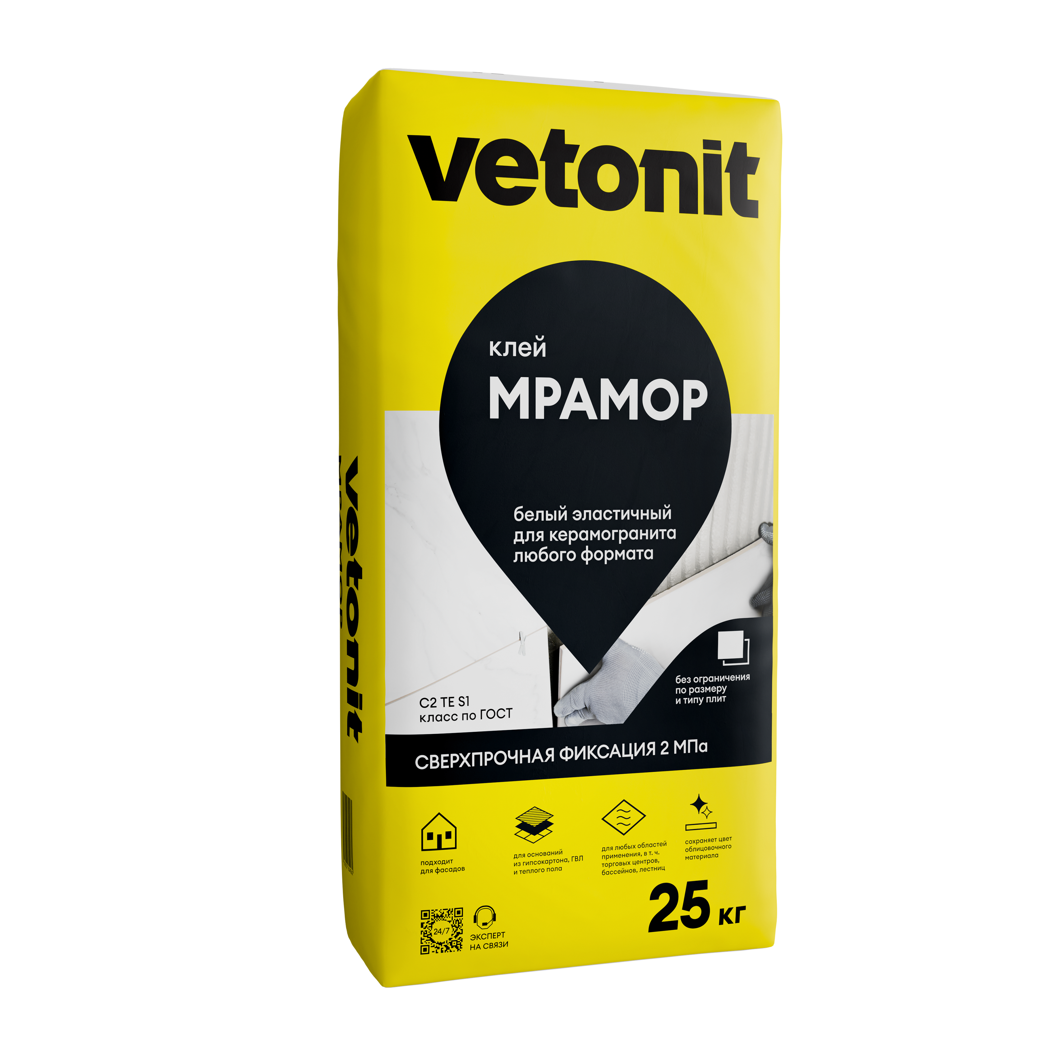 Vetonit® Мрамор - белый клей класса C2 TE S1. Сверхвысокая адгезия, увеличенное открытое время, поперечная деформативность, - всё это делает смесь незаменимой для работы с плитами из мрамора и камня без ограничения формата. Белый цвет и мелкая фракция позволяют использовать клей в качестве затирки. Сохраняет облицовку натурального камня, не оставляет серых цементных пятен.