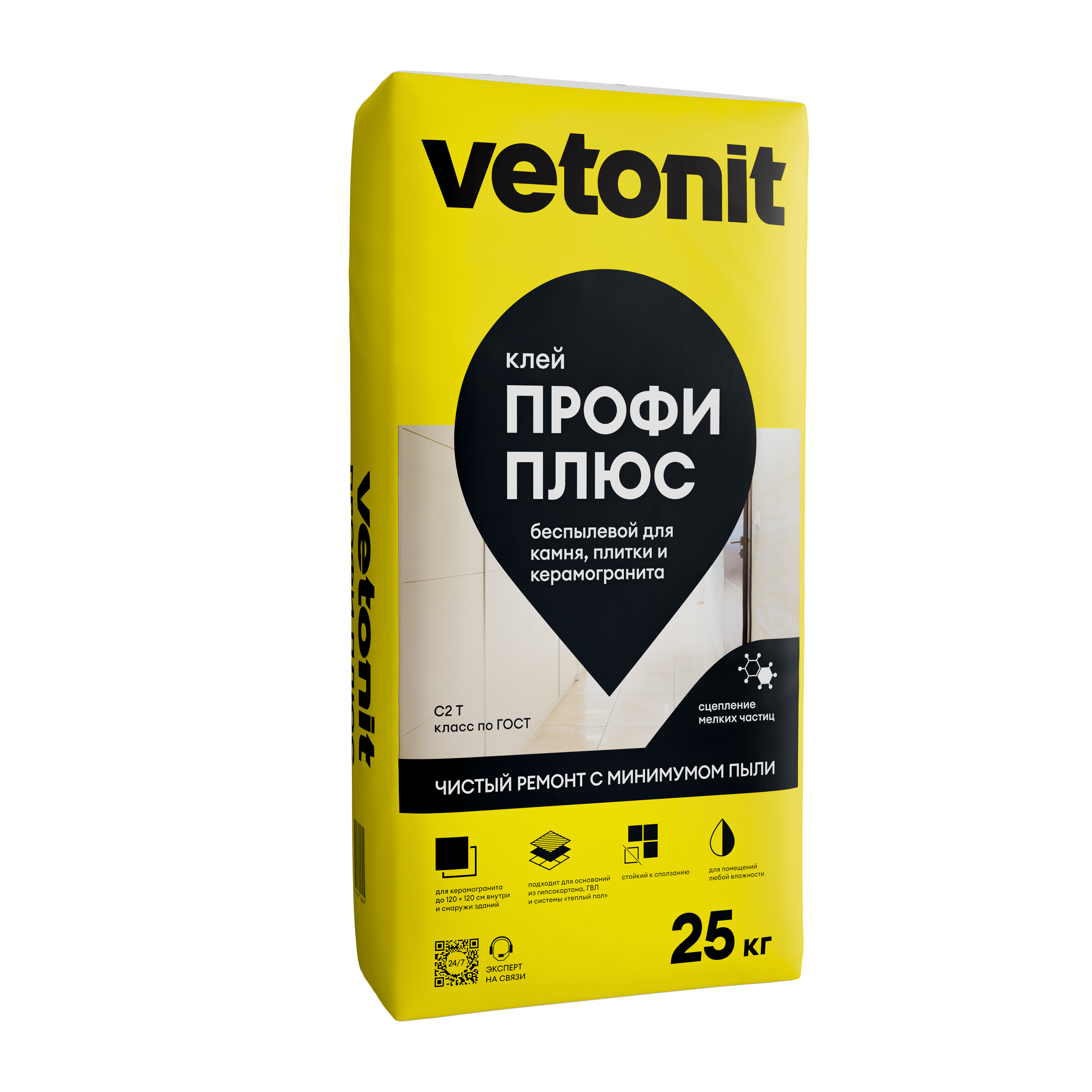 Vetonit® профи плюс - клей класса С1 Т. Уникальная беспылевая формула позволяет сделать ремонт чище, не запачкав финишную отделку соседних зон. Меньше пыли - больше комфорта для работы мастера. Подходит для внутренних и наружных работ. Для стен и пола, включая систему "тёплый пол". Рекомендованный формат керамогранита до 45х45 см на стены и до 50х50 см на пол. Совместим с гидроизоляцией, надёжен в эксплуатации влажных помещений.
