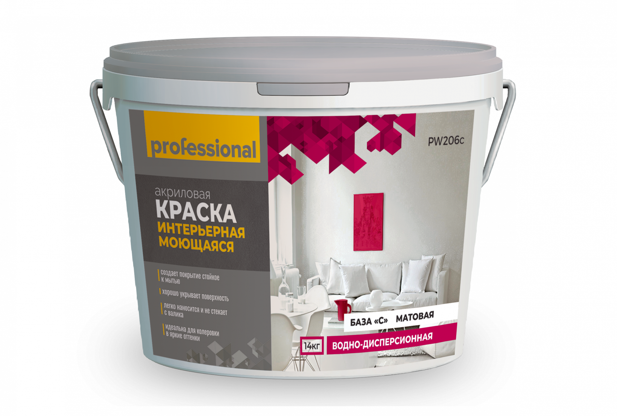 Краска интерьерная моющаяся БАЗА С РW206с ТМ "Professional" предназначена для окраски стен и потолков по минеральным поверхностям (бетонные основы, цементные штукатурки, не глянцевая строительная керамика и т.д.). Акриловая интерьерная моющаяся краска в Базе С предназначена только для колеровки в насыщенные цвета.