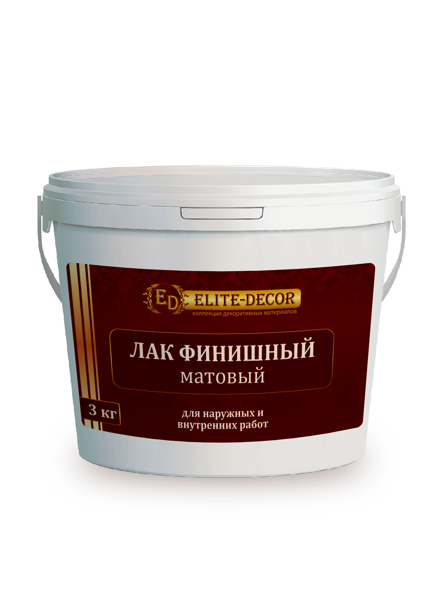 Лак финишный матовый ТМ "ELITE-DECOR" бесцветный материал на акриловой основе для получения декоративного матового эффекта. Лак матовый используется в качестве финишного покрытия для окрашенных поверхностей и декоративных штукатурок. Придает покрытию защитный свойства от вредного воздействия влаги, перепадов атмосферного давления и температур, от грибка и бактерий. Стойкий к воздействию хлора и органических растворителей (сольвент, нефрас, уайт-спирит) и др.