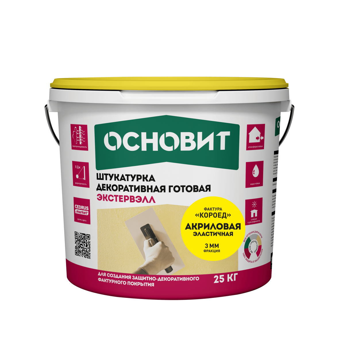 Готовая к применению штукатурка декоративная силикатно-силиконовая Основит Экстервэлл ОSs фактура «короед» предназначена для создания тонкослойного декоративно-защитного покрытия при отделке различных поверхностей, в т.ч. при устройстве системы фасадной теплоизоляции Основит.