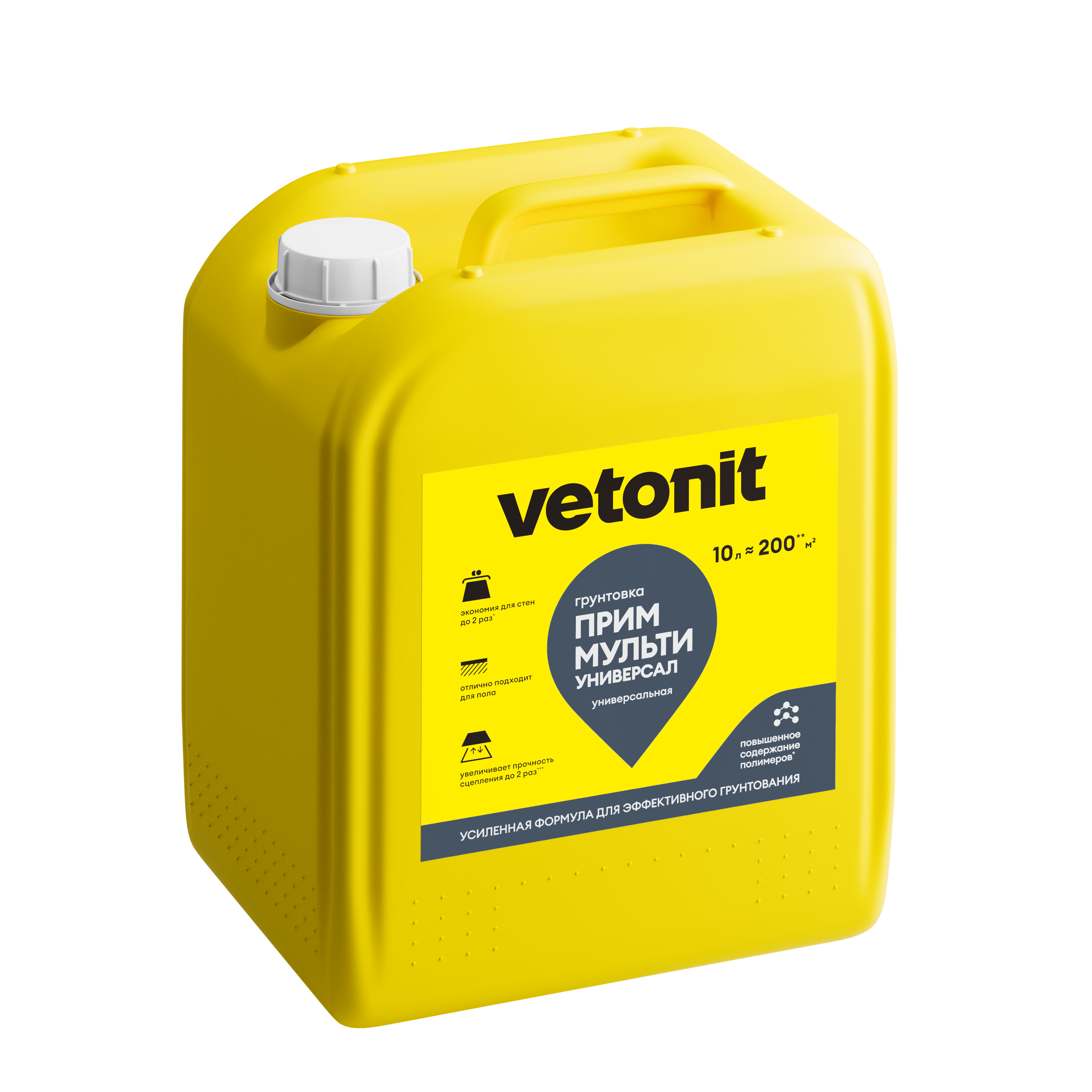 Прим мульти универсал – универсальная укрепляющая грунтовка для качественной подготовки стен, потолков, полов под последующее оштукатуривание, шпаклевание, окрашивание, оклейку обоями, приклеивание плитки, нанесение полимерной гидроизоляции, ровнителей и наливных полов. Высокое содержание полимеров позволяет использовать продукт на 100 м2 пола (без разведения) или на 200 м2 стен (при разбавлении 1:1 с чистой водой), получая тем самым экономию до двух раз. Подходит для внутренних и наружных работ. *По сравнению с грунтовкой vetonit prim optimus.