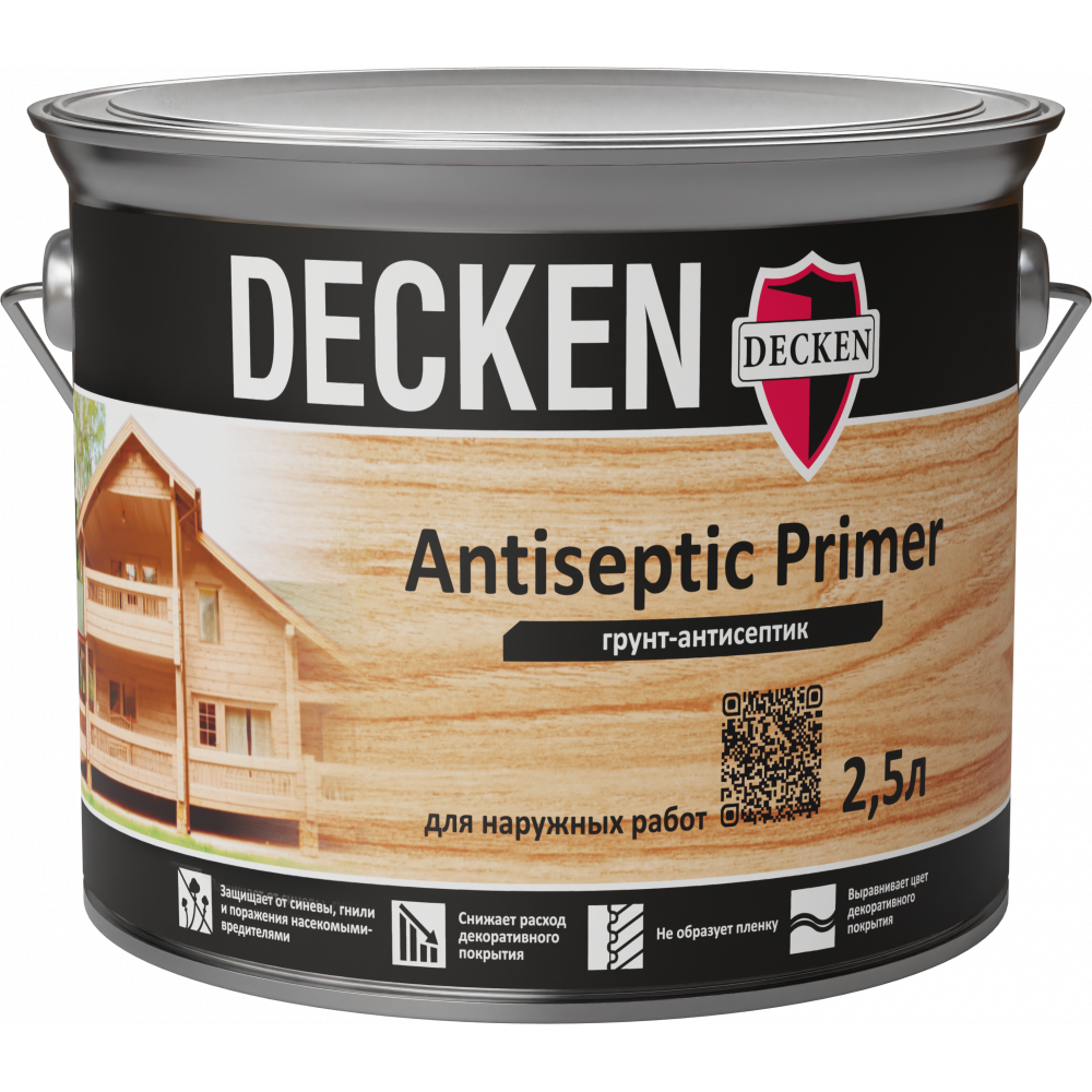 Грунт-антисептик DECKEN Antiseptic Primer – бесцветная пропитка на основе натуральных масел. Грунт предназначен для обработки любых пород древесины для наружных работ: дверей, окон, ставней (недеформирующихся деревянных элементов и конструкций); навесов для автомобилей, деревянных фасадов, балконов, заборов, пергол, садовой мебели и садовых домиков (деформирующихся деревянных элементов и конструкций).
