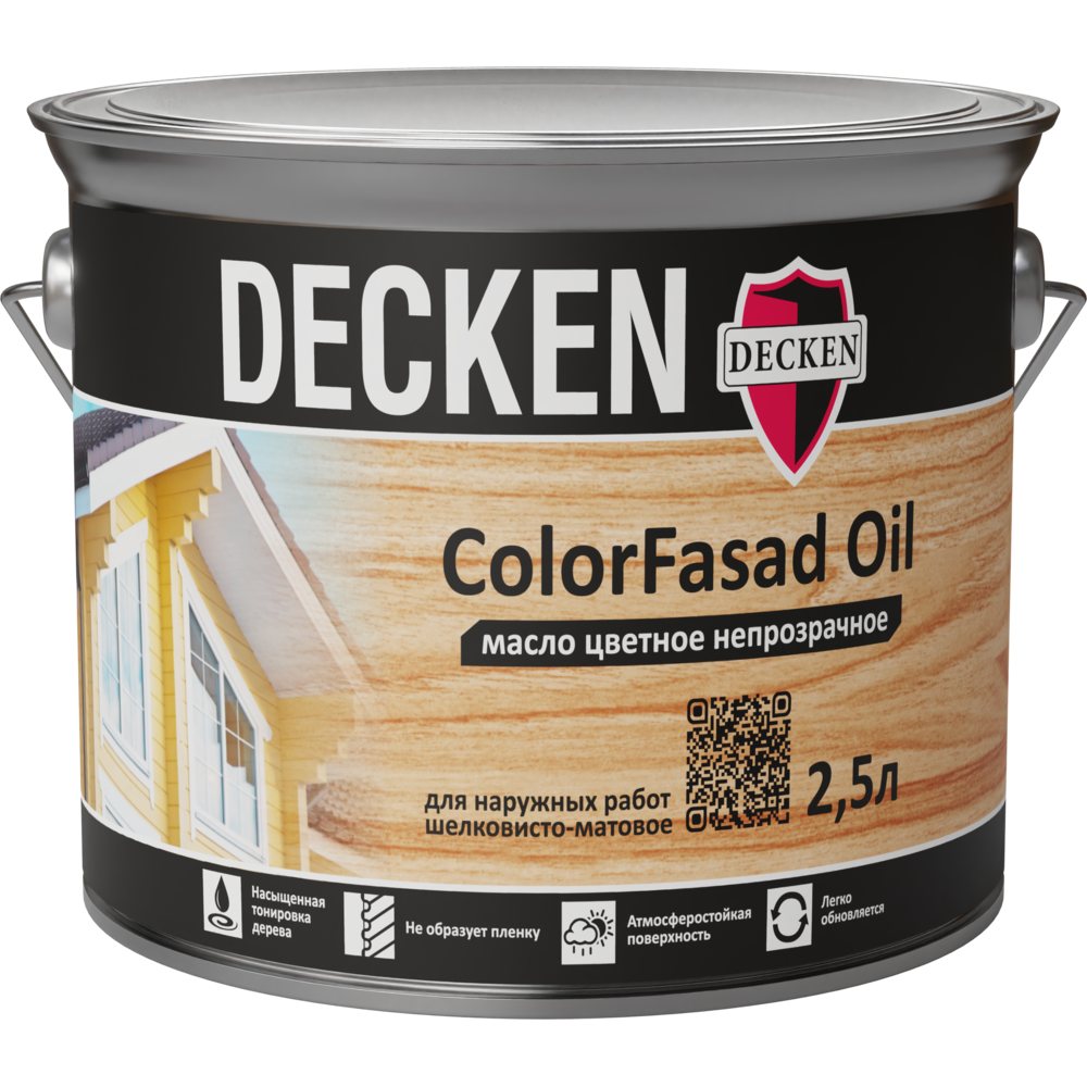 Цветное непрозрачное масло DECKEN ColorInside Oil предназначено для создания декоративной поверхности на стенах, потолках внутри помещений, а также мебели, декоративных изделий и поделок и т.п. Допускается применение в качестве первого тонировочного слоя при обработке деревянных полов. Допускается использование при проведении наружных работ, в том числе для обработки деревянных фасадов, балконов, окон, ставней, заборов, пергол, беседок, деревянной черепицы, садовой мебели, навесов для автомобилей и т.п. (устойчиво к внешним воздействиям и УФ-лучам).