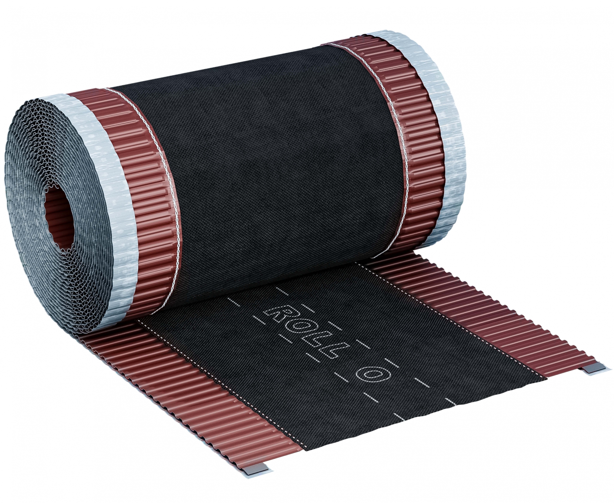 Коньковая лента Eurovent® ROLL O изготовлена из профилированного алюминиевого листа, PP ткани и бутиловой ленты. Используется как вентиляционный и защитный элемент, защищающий крышу в области конька от влаги и пыли, обеспечивающий правильную вентиляцию кровли.