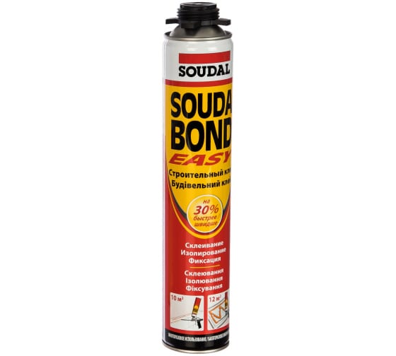 Полиуретановый клей Soudabond Easy Gun - быстросохнущий клей в аэрозоле с высокой производительностью для приклеивания гипсокартонных плит и панелей из пенопласта внутри и снаружи помещений. Характеризуется отличной адгезией к большинству материалов, в том числе к влажным поверхностям. Объем: 750 мл. Применение Приклеивание гипсокартонных плит и из волоконного цемента в технологии сухой застройки, декоративных плит, из древоподобных материалов и пластмасс, металлических листов и т. д. ко всем распространенным строительным материалам Крепление плит и изолирующих панелей из различного типа полистирола, полиуретана, вспененного фенола (PUR, PIR, XPS, EPS, PF), а также минеральной ваты и пробки к бетону, кирпичу, камню, древесине и металлам (например, при изоляции и утеплении контейнеров, гаражей и т. д.) Приклеивание блоков из газобетона и пористой керамики в перегородках (конструктивно ненагруженных) и малой архитектуре. Свойства Готов к применению, не требует каких-либо дополнительных инструментов. Быстросохнущий - полное отверждение ок. 60 минут (при 20° C/65 % RH). Высокопроизводительный - 12 м2 (при прокладывании полоски диаметром 30мм). Тиксотропный - не стекает с вертикальных поверхностей. Обеспечивает дополнительную термо- и звукоизоляцию. Отличная адгезия к большинству строительных материалов: кирпичу, бетону, штукатурке, гипсу, дереву, металлу и пластмассам. В случае необходимости шов можно окрашивать