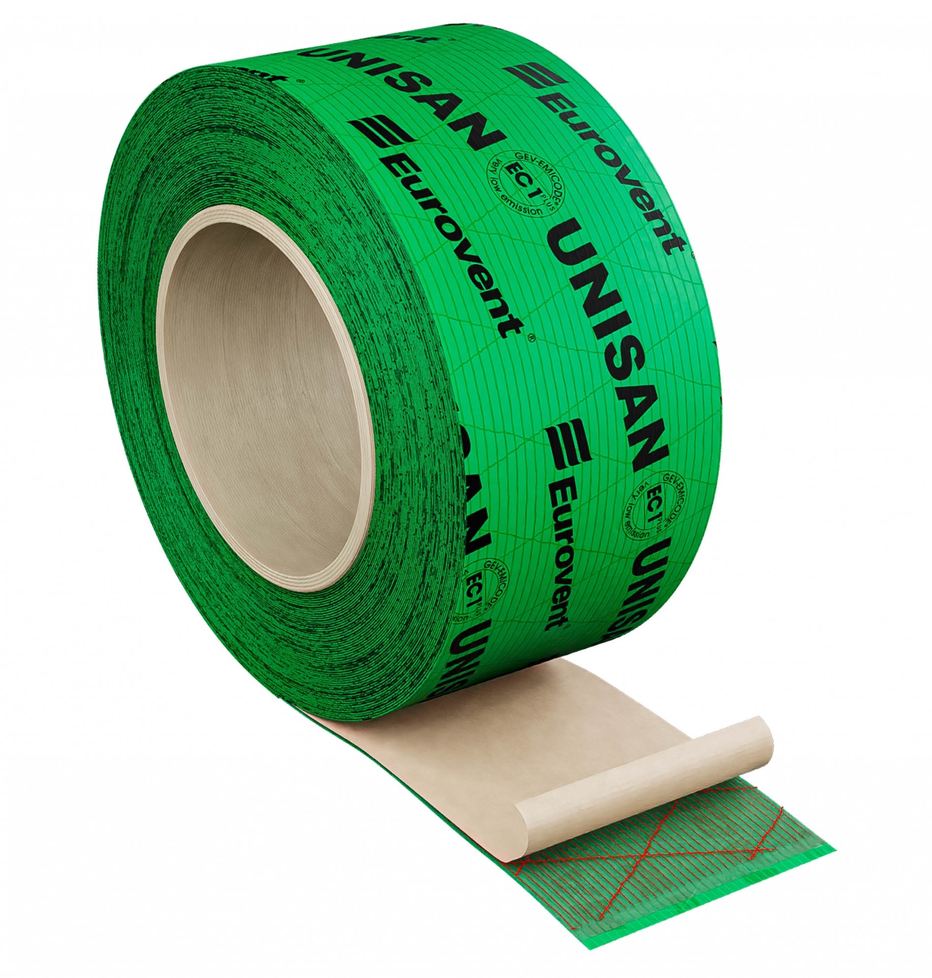 Eurovent® UNISAN – это специальная односторонняя клейкая лента, изготовленная из PE-пленки, усиленной полиэфирным волокном, и специального клея на основе акриловой дисперсии. Применение: широкий спектр, включая склеивание и ремонт материалов из пластмасс, таких как паропроницаемые и паронепроницаемые мембраны, и их склеивание с древесиной и металлическими элементами. Поверхности склеиваемых элементов должны быть сухими и чистыми. Температура применения мин./макс.: +5°C до +40°C. Лента Eurovent® UNISAN получила сертификат Passiv House Institute в классе герметичности phA.