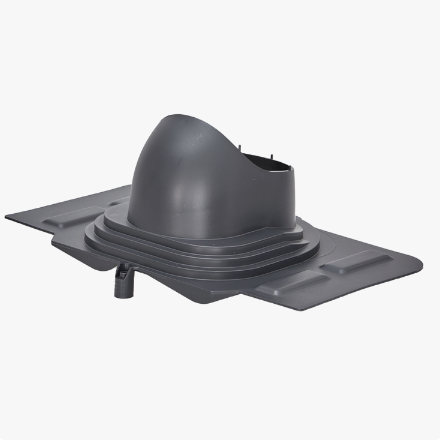 Проходной элемент служит основанием для монтажа вентиляционного выхода. Применяется на кровлях из металлочерепицы или на других типах покрытия скатных кровель с любым типом профиля с высотой до 70 мм (в том числе и натуральная черепица при использовании сверла по стеклу и керамике, и саморезов для кирпича) для установки вентиляционных труб. В комплекте имеется резиновый уплотнитель (мастер флеш), который крепится непосредственно к кровле и обеспечивает герметичность соединения. Изготовлен из качественного полипропилена, лёгкий. Материал не подвержен коррозии.
