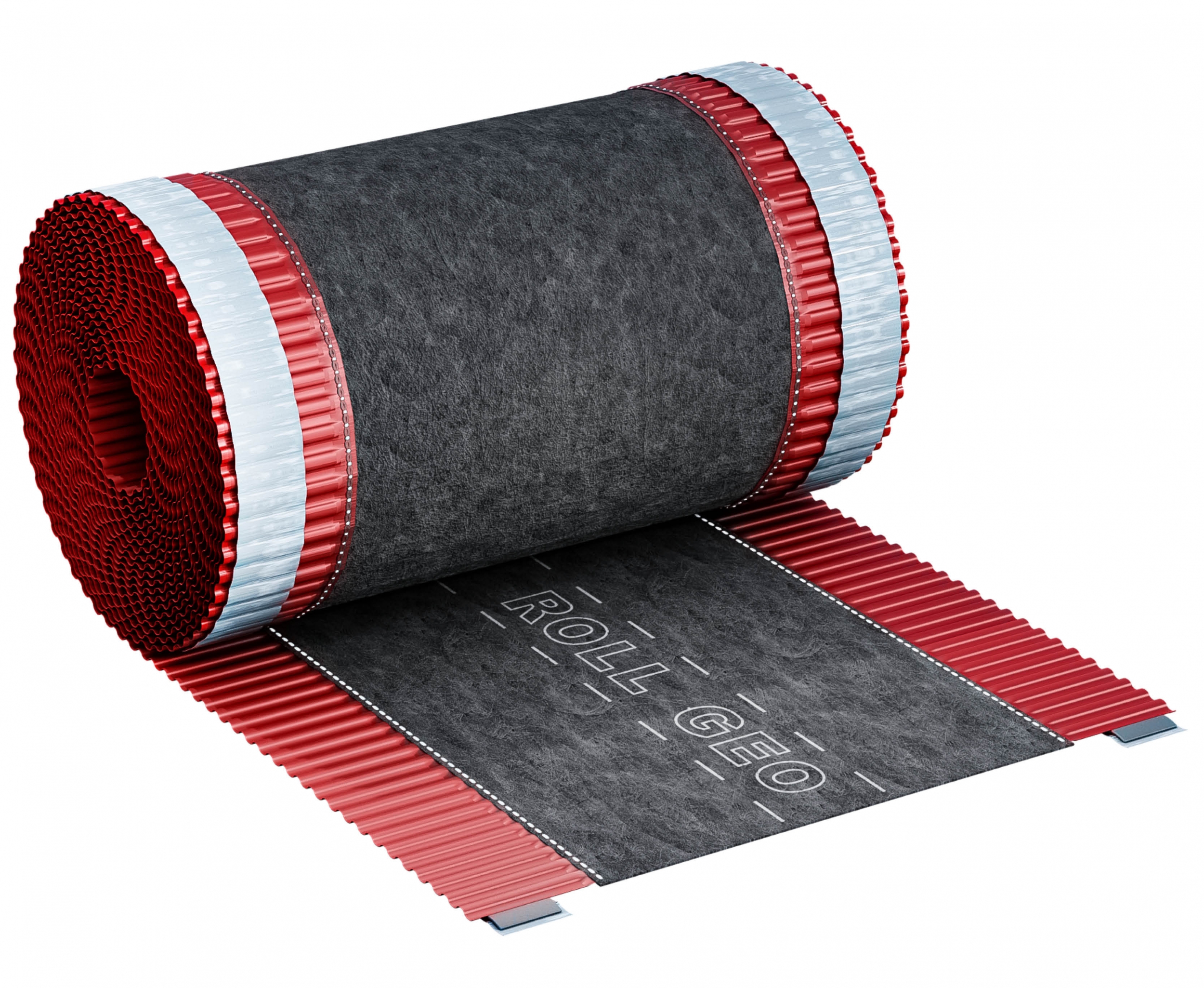 Коньковая лента Eurovent® ROLL GEO, oднослойная коньковая лента для горизонтальных и косых коньков. Изготовлена из профилированного алюминиевого листа, геотекстили и бутиловой ленты. Дополнительным укреплением соединения алюминевого листа и геоткани является шитье специальной нитью.