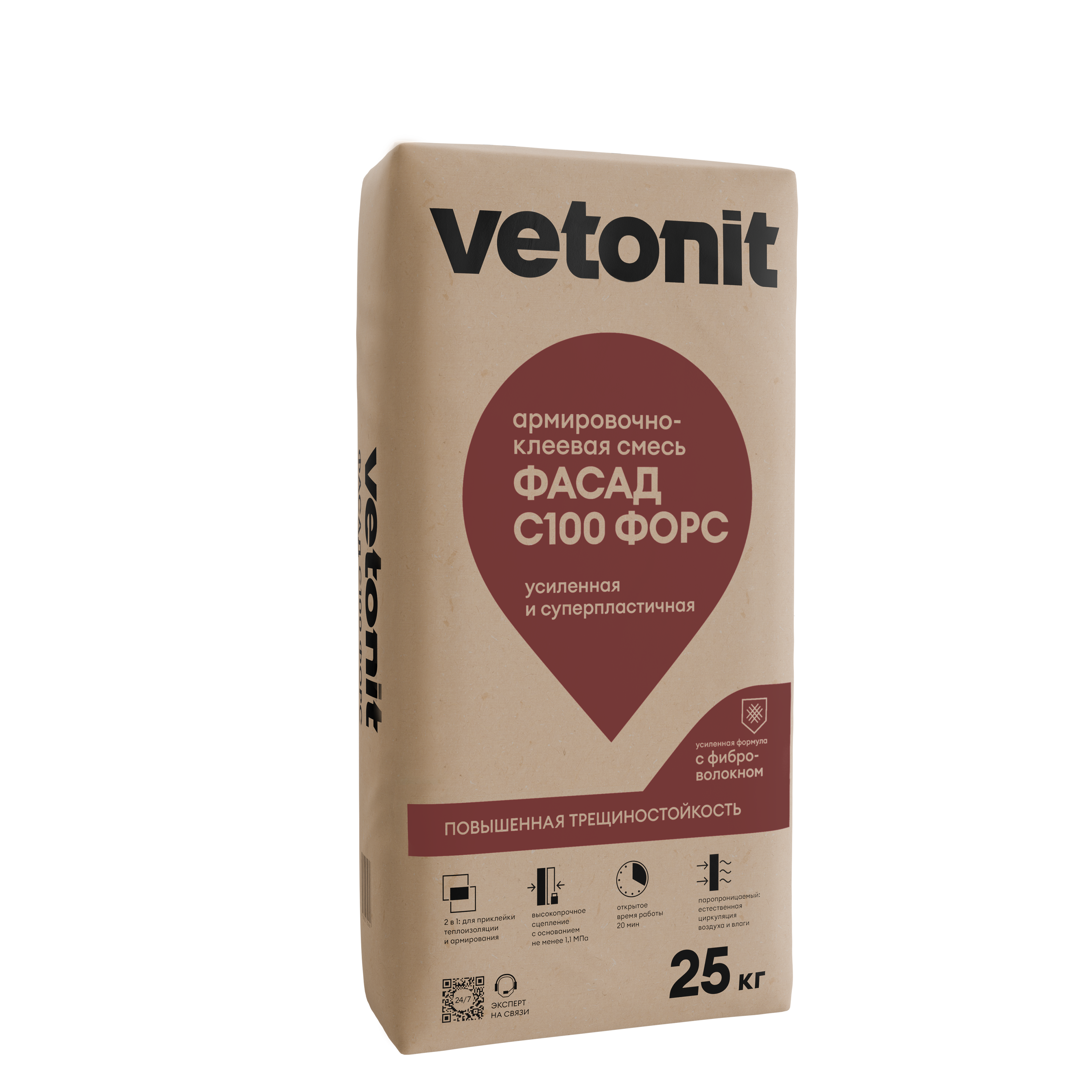 Vetonit® фасад С100 форс - усиленная армировочно-клеевая смесь для монтажа теплоизоляции и создания базового штукатурного армированного слоя в СФТК. Содержит в себе микроволокно, обладает высокой прочностью более 10 Мпа и адгезией не менее 1.1 Мпа, обеспечивая прочность монтажа фасада. А благодаря высоким прочностным характеристикам и пластичности, смесь будет удобна для работы даже новичку. Увеличенное открытое время работы с материалом 20 минут! Идеально подходит для фасадов из-за высокой паропроницаемости. Продукт доступен в морозостойкой версии для работ до -10 °C окружающей среды и основания.