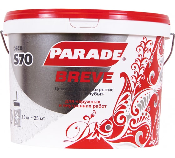 Декоративное покрытие PARADE DECO Breve S70 с эффектом мелкой шубы, белый, 15 кг образует высококачественное матовое покрытие с рельефной поверхностью под "шубу" (максимальный размер зерна 0.5 мм).